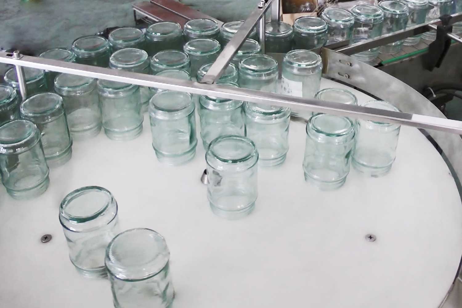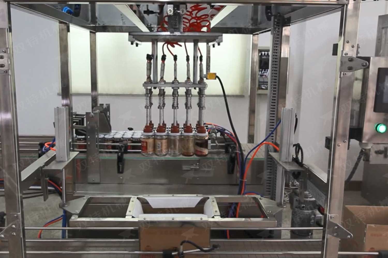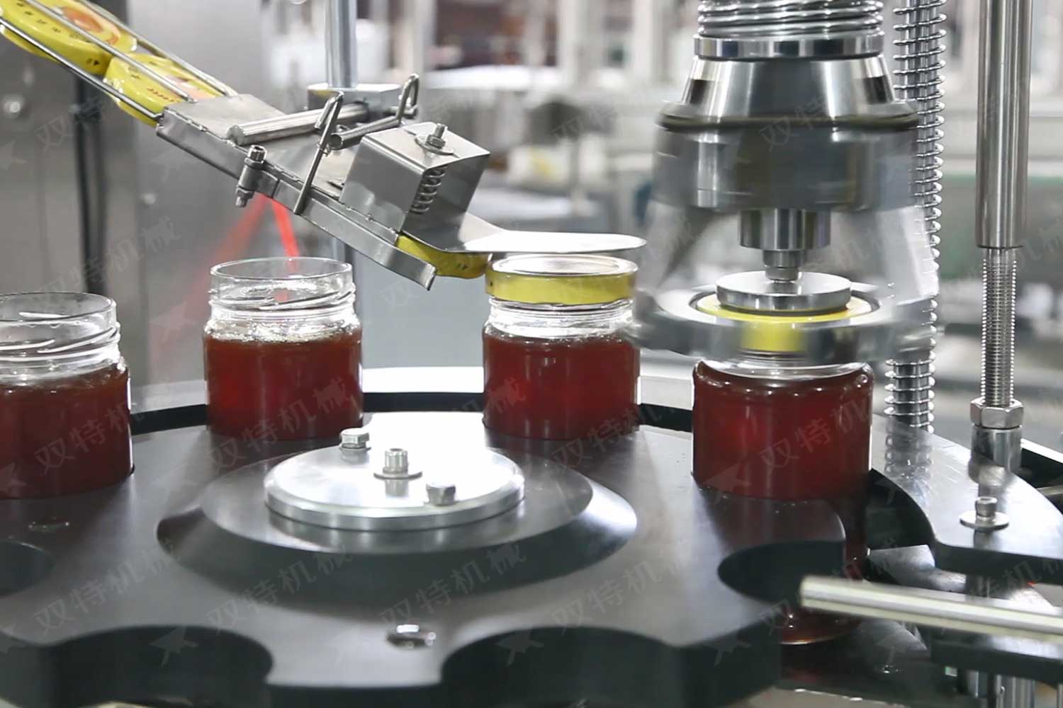 旋盖机主要用于玻璃广口瓶的三、四、六铁盖真空旋盖,用两根不同速度的皮带压瓶盖,因两根皮带的速度不同,对盖进行搓盖收紧达到旋盖目的。在自动上盖之前对瓶口吹蒸汽加热,吹掉冷空气,换上高温蒸汽,立即旋盖,根据热胀冷缩原理,蒸汽冷下来就自然形成了瓶内真空,达到了真空旋盖的目的。自动旋盖机可以和浓酱灌装机、蜂蜜灌装机、辣椒酱灌装机组合在一起,形成一套全自动灌装设备,是现代调味品企业的得力帮手。