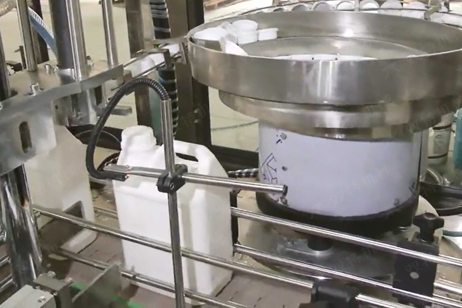 旋盖机主要用于玻璃广口瓶的三、四、六铁盖真空旋盖,用两根不同速度的皮带压瓶盖,因两根皮带的速度不同,对盖进行搓盖收紧达到旋盖目的。在自动上盖之前对瓶口吹蒸汽加热,吹掉冷空气,换上高温蒸汽,立即旋盖,根据热胀冷缩原理,蒸汽冷下来就自然形成了瓶内真空,达到了真空旋盖的目的。自动旋盖机可以和浓酱灌装机、蜂蜜灌装机、辣椒酱灌装机组合在一起,形成一套全自动灌装设备,是现代调味品企业的得力帮手。